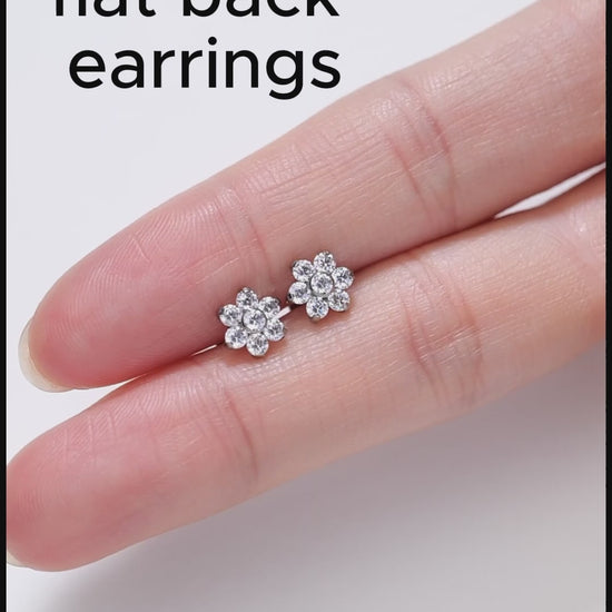 Indulge in the ultimate combination of style and comfort with this minimal sized flat back push on or threadless stud.  Each of the 6 petal shapes are intricately crafted to mimic the natural beauty found in a flower has a gem available in 1.5 mm clear zircon gems or 2 mm clear gems. These earrings are not only a stunning addition to any outfit, but they also provide a sense of connection to the natural world. The studs are all polished titanium 20 gauge post diameter with a seventh gem stone in the center. The earring has been made so that it is hypoallergenic, meaning those who have sensitive skin will be able to enjoy wearing these! They are made from high-quality titanium, a material known for its hypoallergenic properties. We know how important looking nice without sacrificing your health can be.